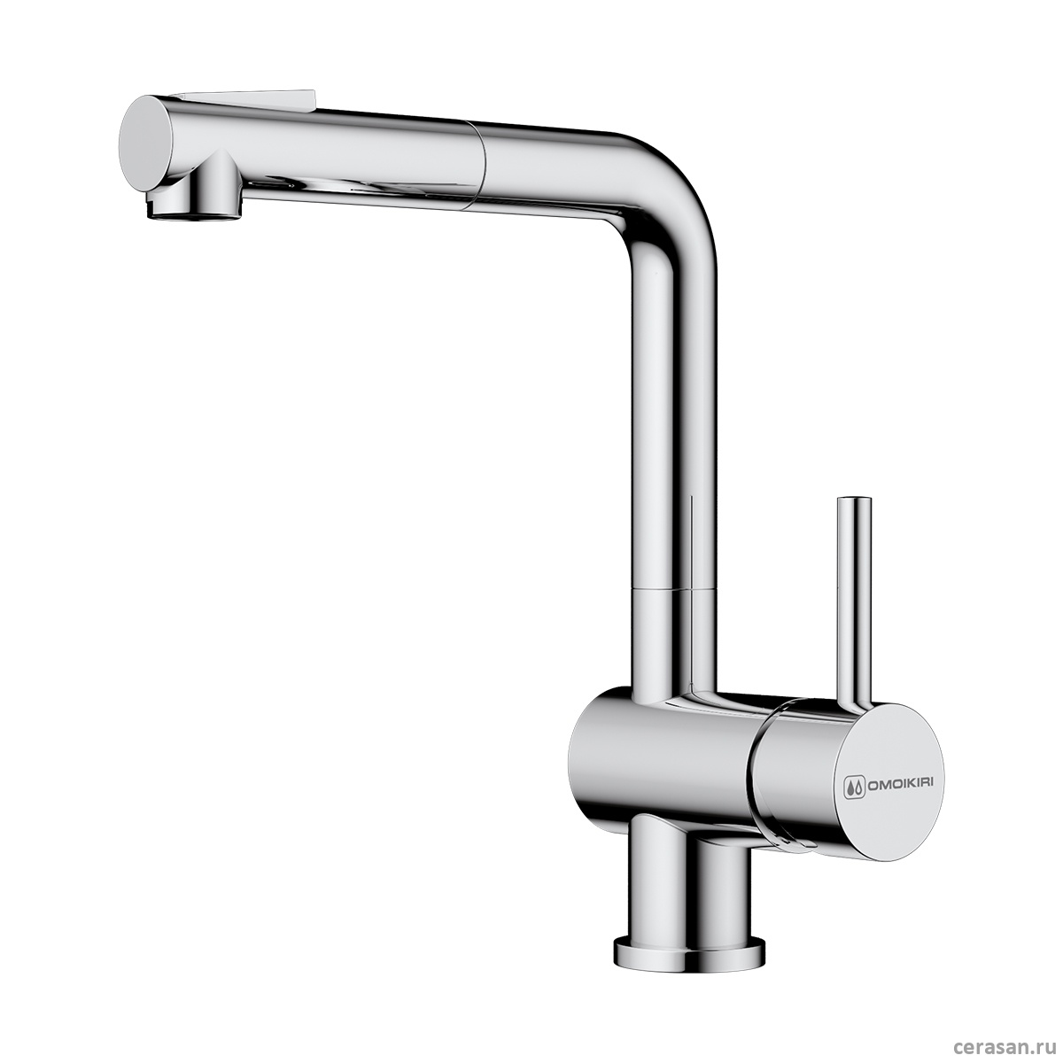 Практичный однорычажный смеситель выполнен в современном стиле и снабжен высоким поворотным изливом и вытяжным шлангом.